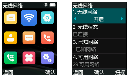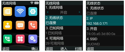首先是將國威GW36電話機連接WiFi,操作:選擇無線網絡、開啟無線網絡、連接無線網絡