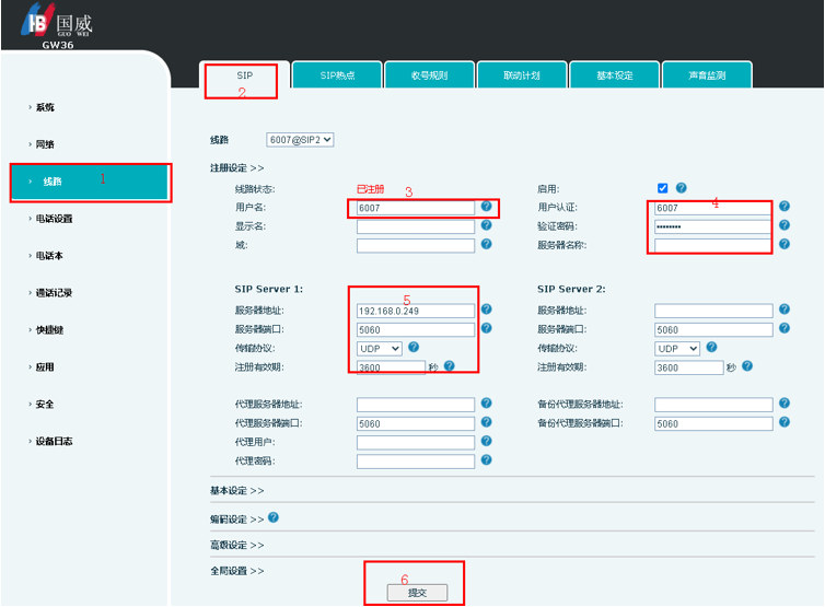 3.配置:登錄話機網頁后,進入【線路】>【SIP】,填寫用戶名、驗證密碼、服務器地址、服務器端口(此信息在國威IPPBX主機貼紙上有詳細說明,便于用戶快速完成IP電話系統部署),并勾選啟用選項,配置完成后點擊提交完成注冊。