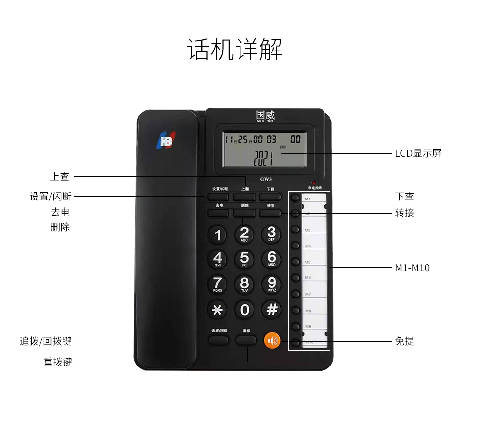 國威GW3具備強大的10組可自編輯存儲按鍵(M1-M10),用戶可以存儲常用號碼、或者部門電話,實現一鍵呼叫,避免重復撥號。