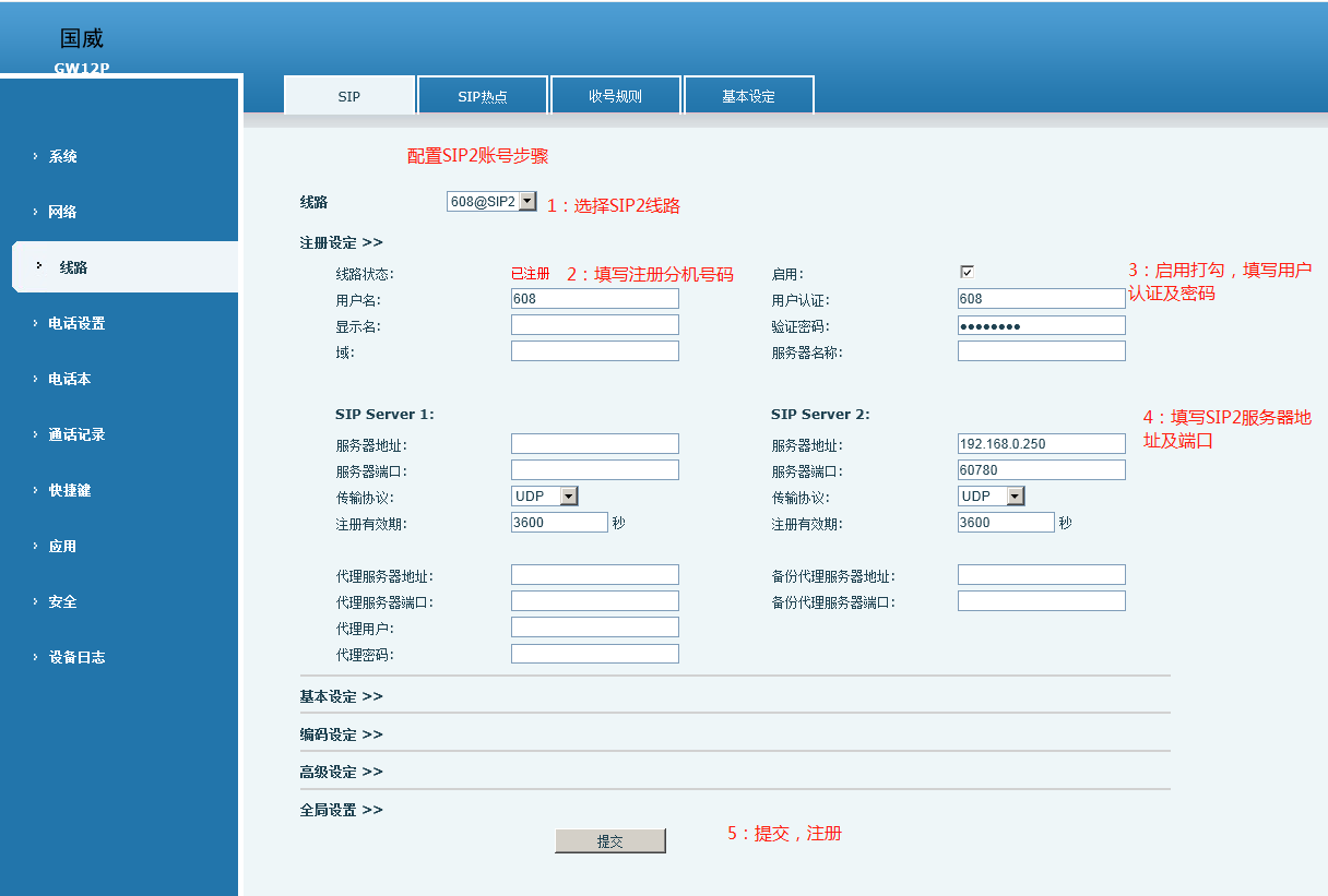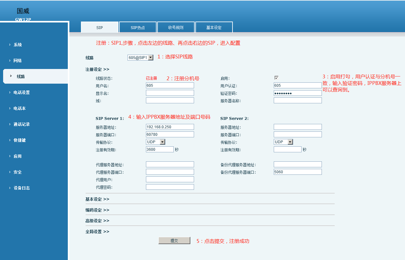 菜單→高級→密碼(123)→賬號→SIP1→設置→注冊(開啟)→注冊地址(填寫IPPBX服務器地址)→注冊用戶名(分機號)→注冊密碼(填寫)→SIP用戶(與分機號一致)→注冊端口(IPPBX注冊端口)→最后點擊確認,注冊成功!