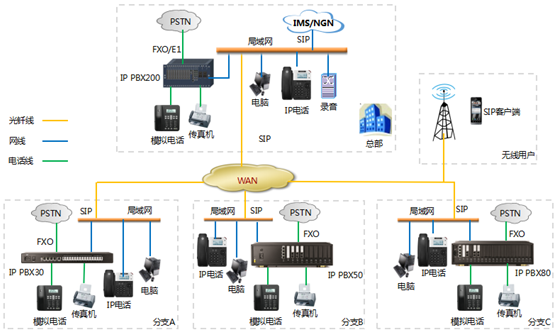 IP PBX200可作為核心軟交換設備放置在公司總部及重要分支機構,上行通過FXO/E1接入PSTN網絡或者經IP網絡接入IMS網絡。各分支機構使用模擬電話和IP電話等終端連接至各分支IP PBX,同時各分支IP PBX通過SIP中繼連接到總部IP PBX,實現(xiàn)公司所有電話終端內部通話零話費,撥打分支機構所在地市話無長途費等。